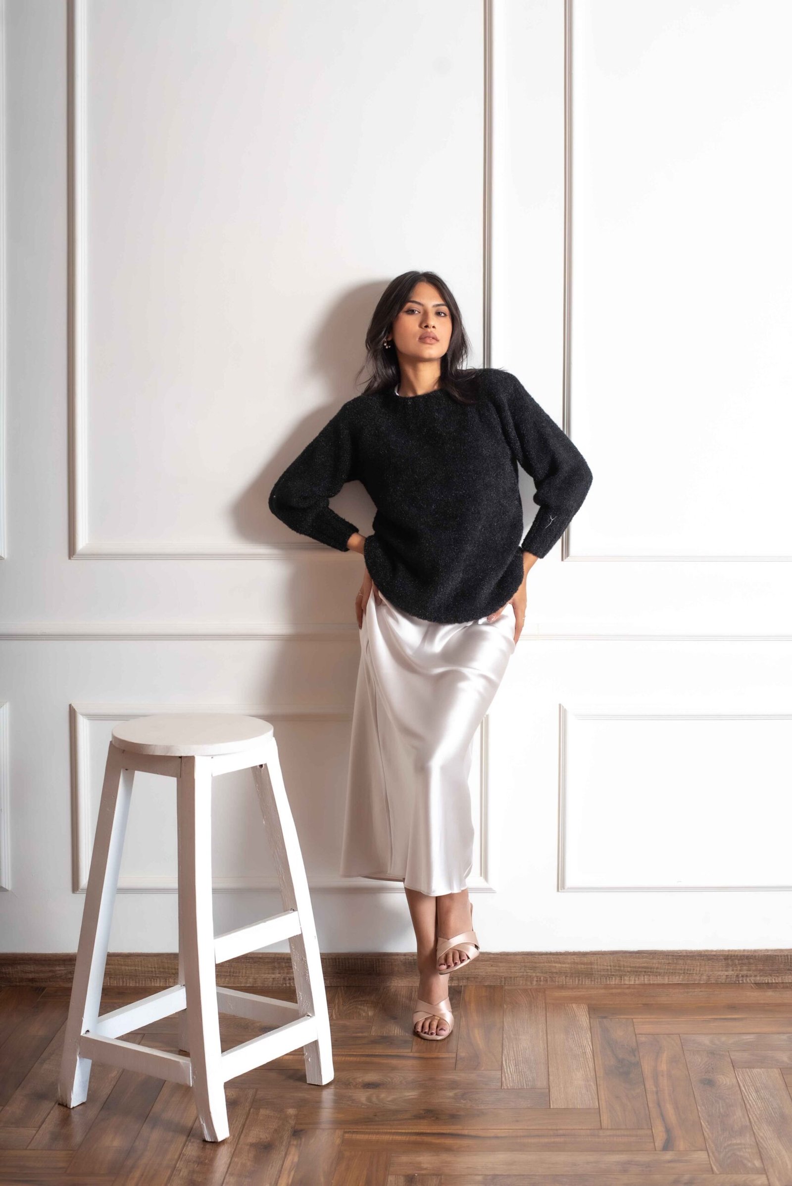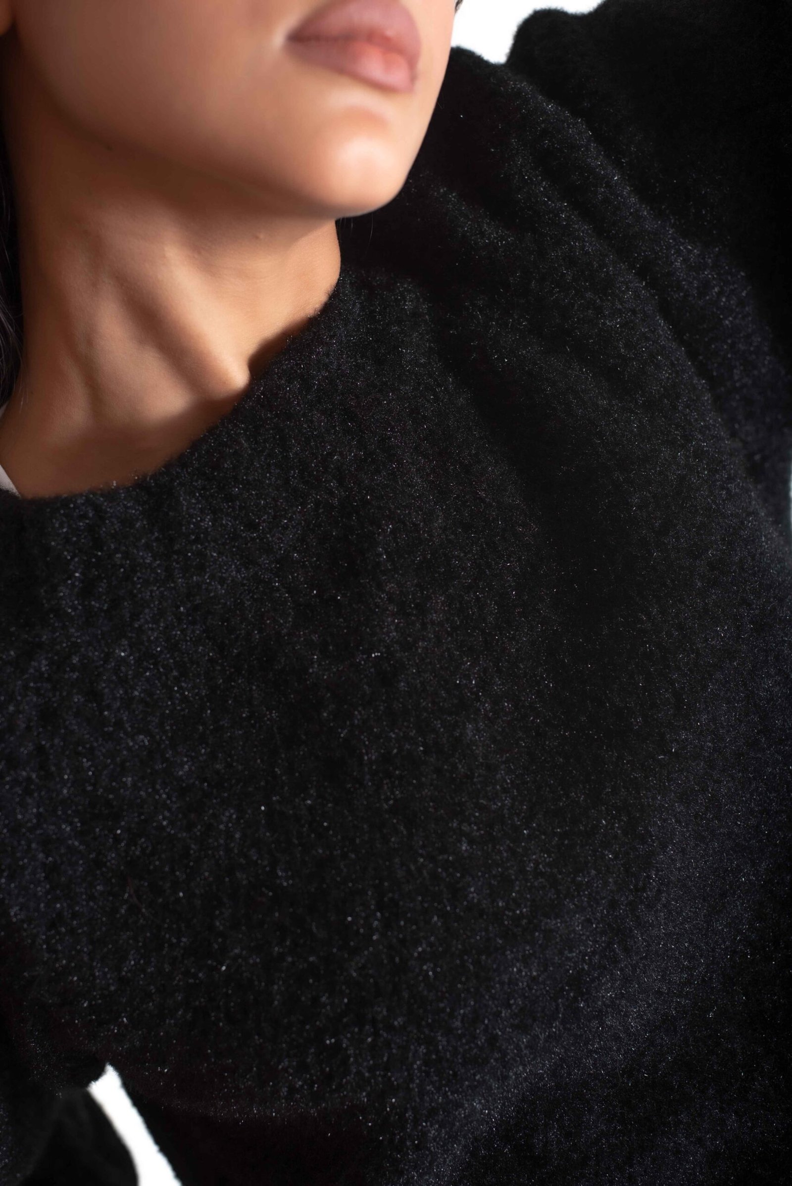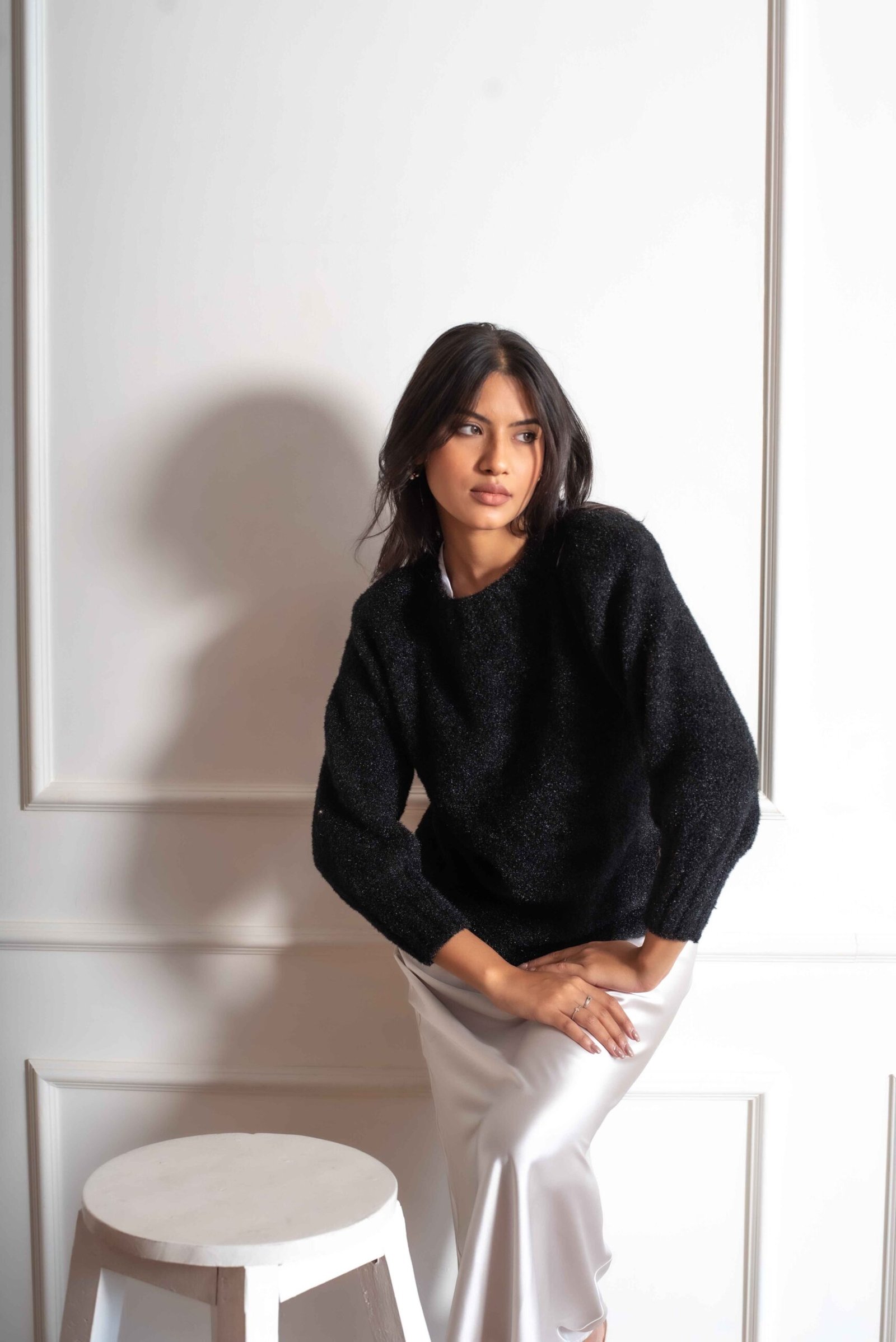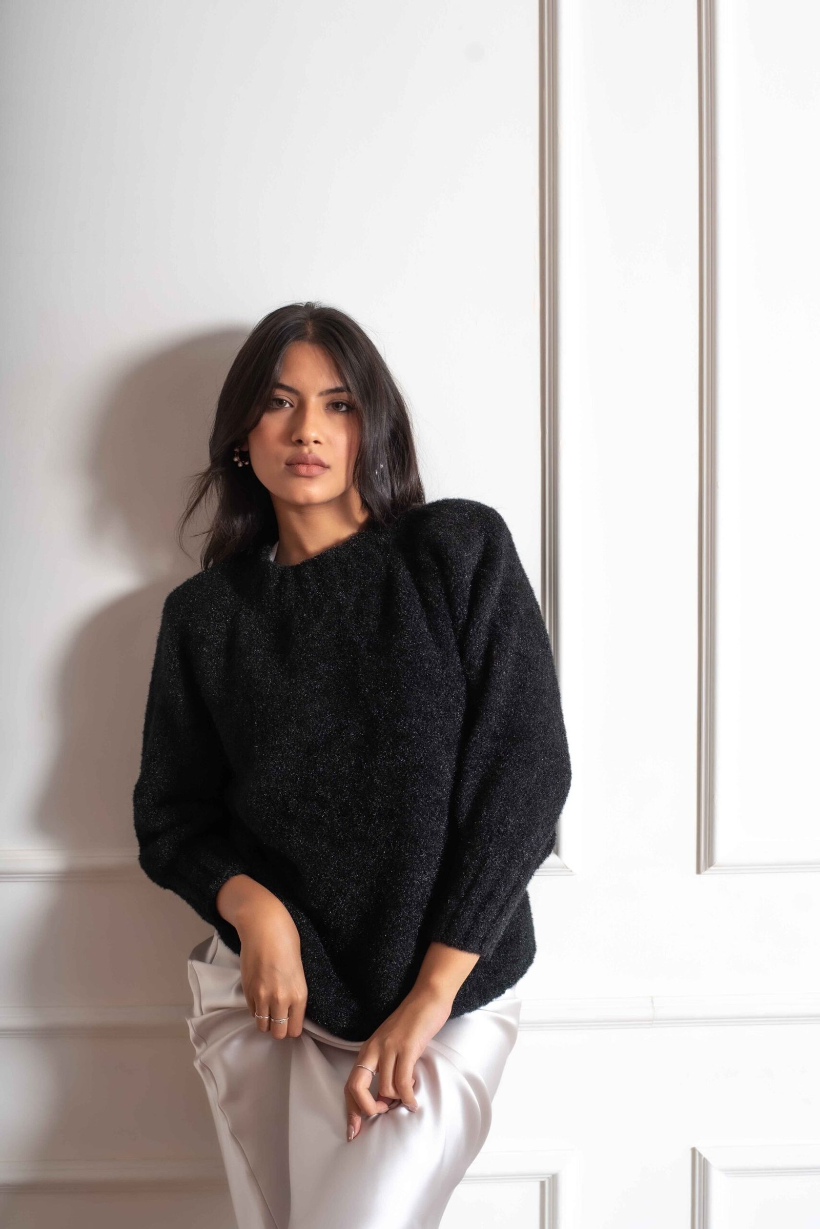 This black sweater exudes effortless elegance and comfort. It features a relaxed, slightly oversized fit that flatters various body shapes, with a drop-shoulder design that enhances the laid-back vibe. The soft, textured fabric ensures warmth and coziness, making it perfect for winter seasons Perfect for fashion-conscious individuals looking for both style and comfort, this sweater is a must-have piece for any collection.