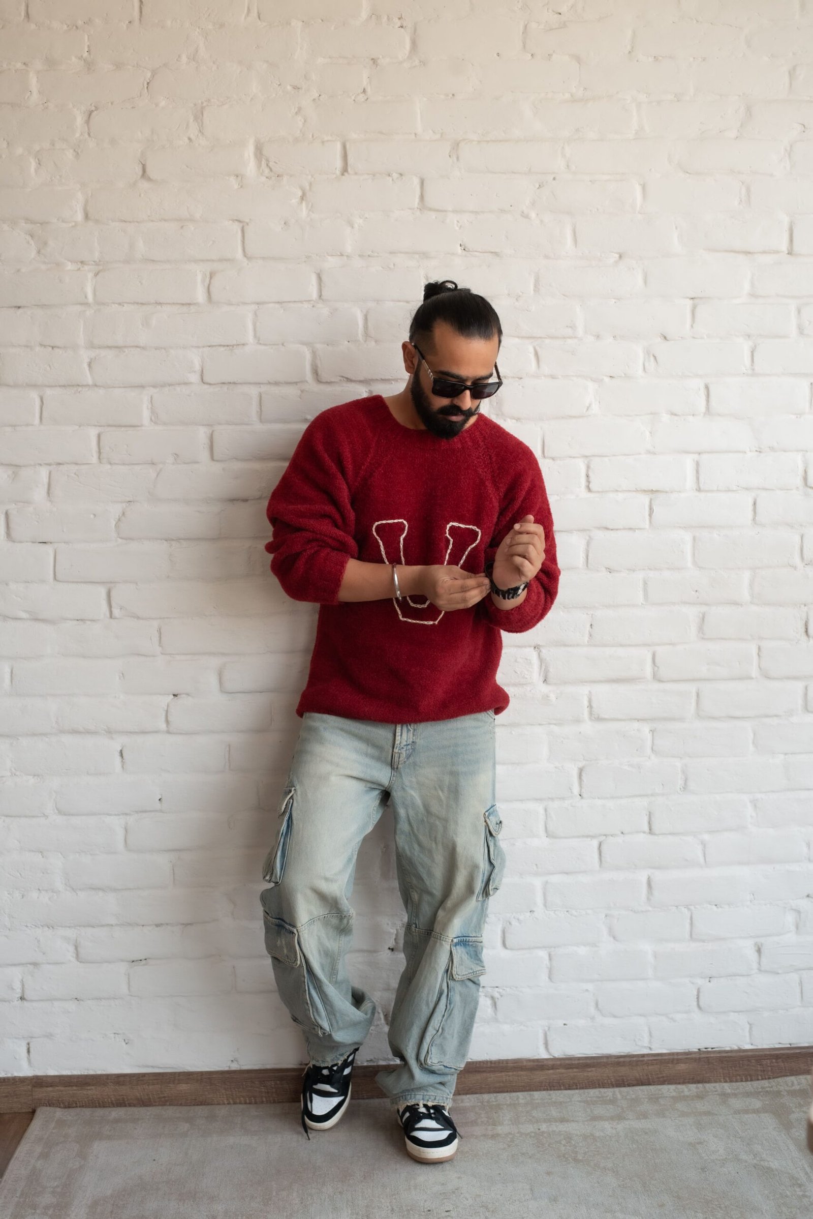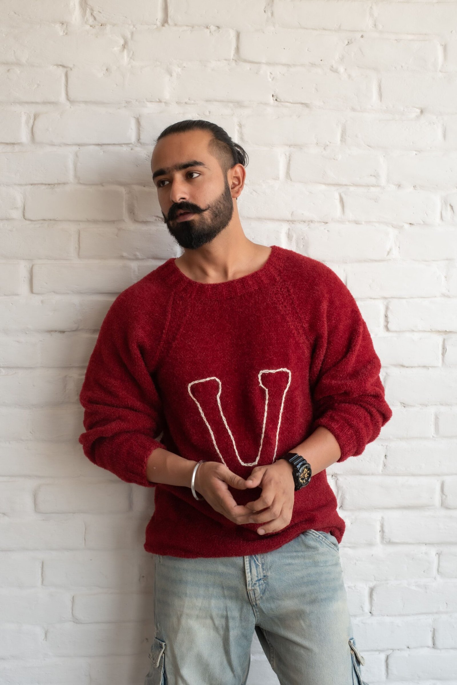 This vibrant red sweater draws inspiration from classic Harry Potter fashion, featuring a prominent varsity-style “V” reminiscent of the iconic Weasley sweaters from the series. The cozy, textured knit brings both warmth and charm, with a casual fit and relaxed raglan sleeves that exude comfort. Perfectly suited for a fan of the wizarding world, this sweater blends a nostalgic, magical touch with modern streetwear sensibilities, especially when paired with laid-back cargo jeans.