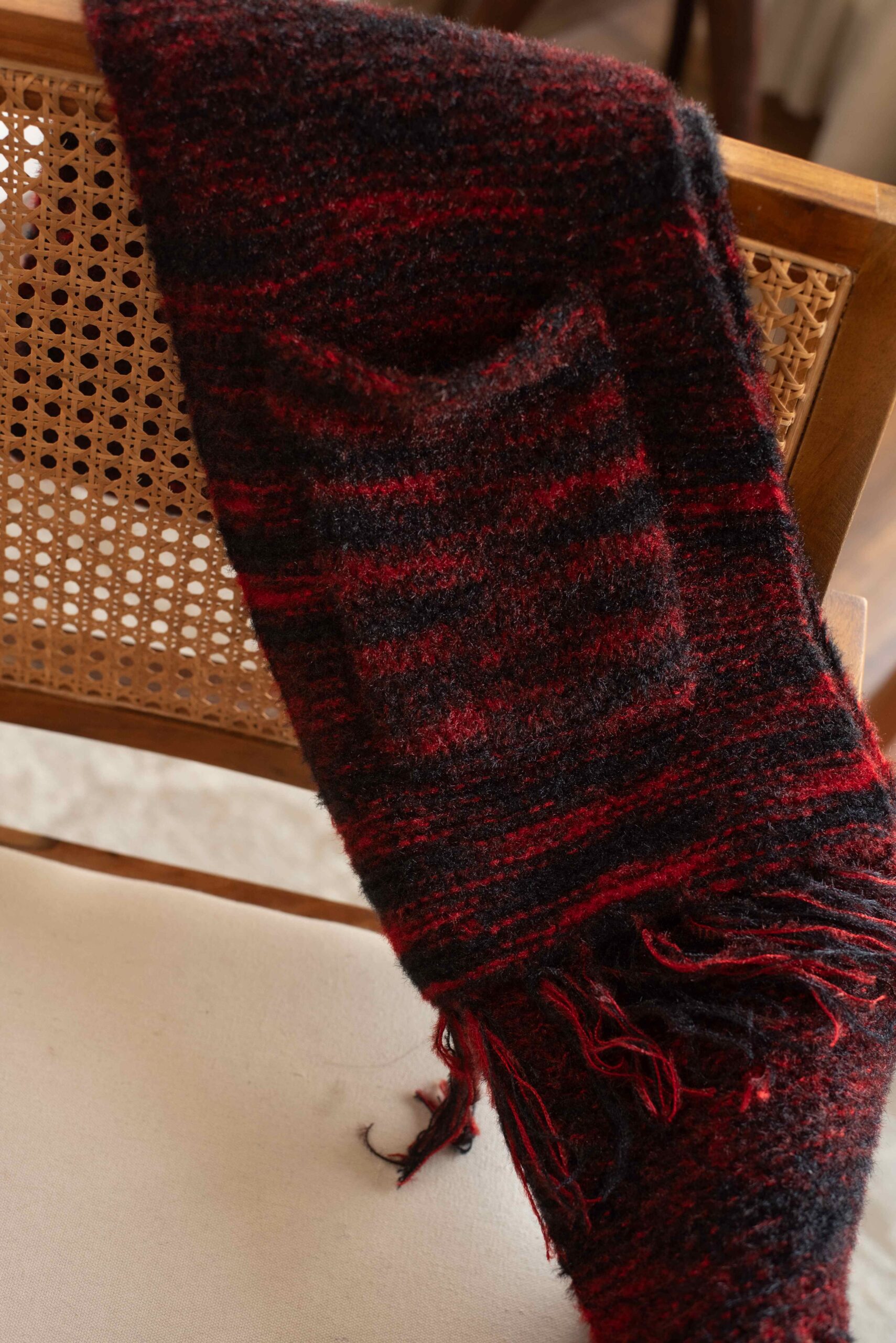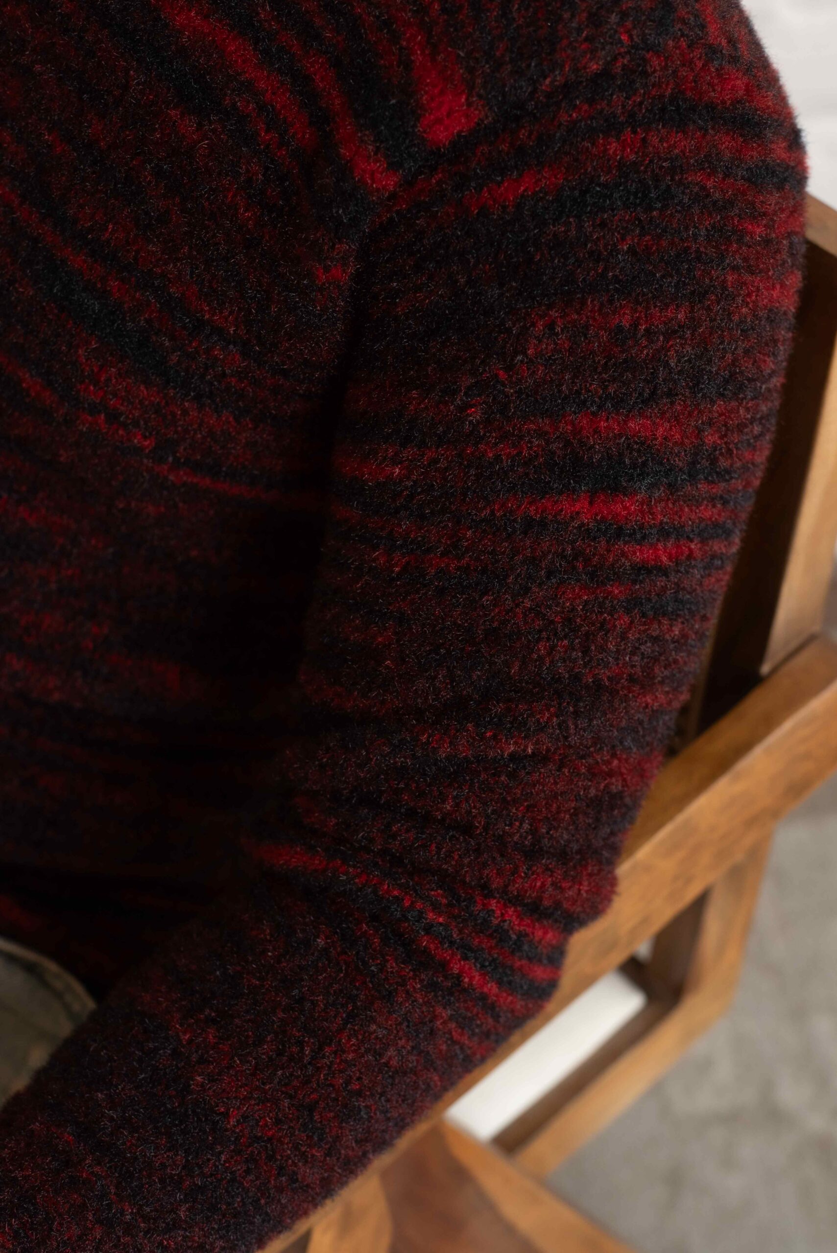 This sweater boasts a bold and rugged style, featuring a deep red and black marled knit pattern that gives it a textured and dynamic appearance. The round neckline and full-length sleeves maintain a classic silhouette, while the slightly fitted design enhances the masculine shape. Made from a thick, cozy fabric, this sweater is perfect for cooler days, offering warmth without sacrificing style.