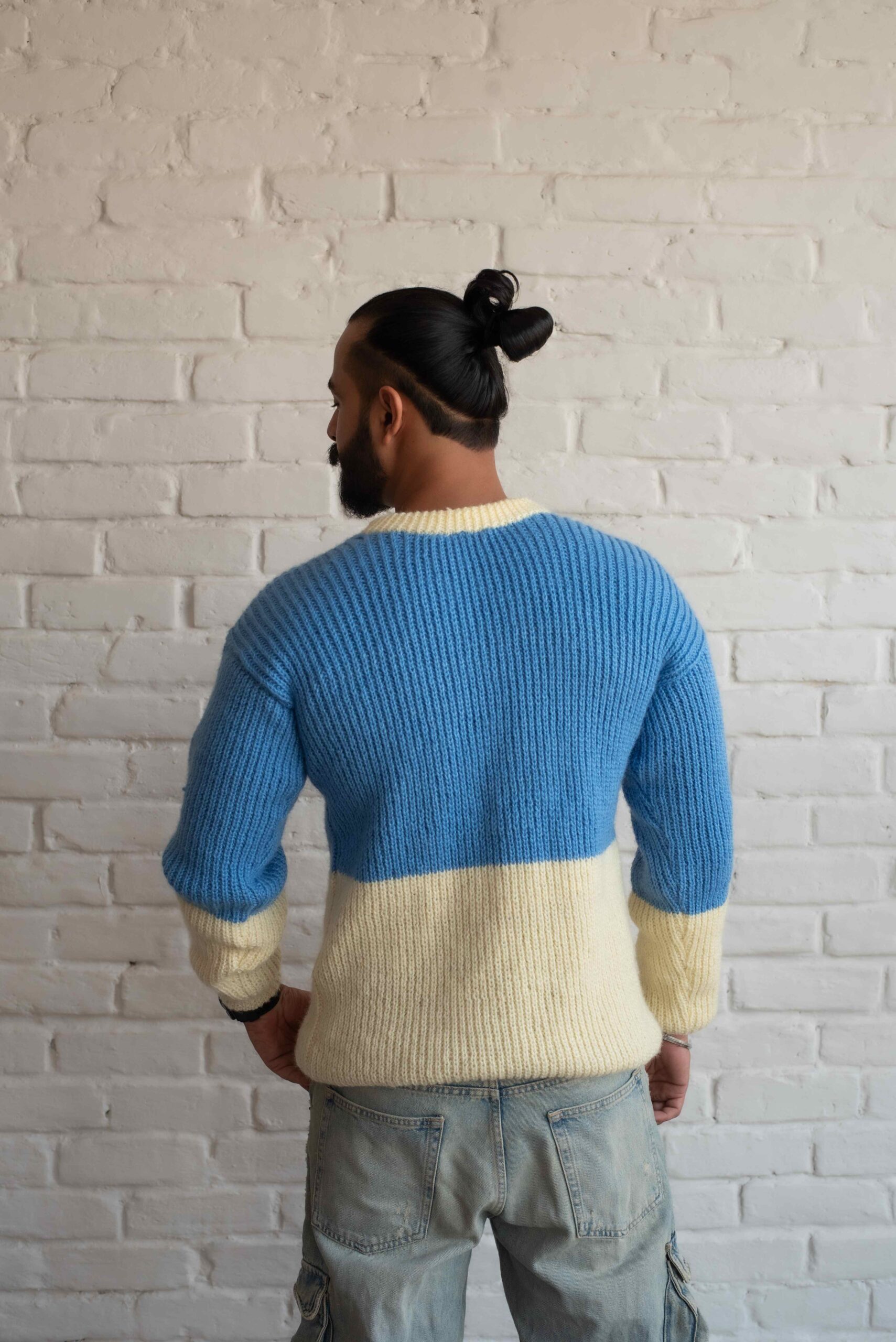 This sweater has a stylish and cozy design, featuring a relaxed fit and ribbed texture. It is crafted in two soft shades: A sky blue for the main body and cream at the hem, cuffs, and collar, creating a bold contrast. The sweater’s ribbed knit adds a plush, thick feel, making it ideal for cooler days. It’s perfect for a casual, laid-back look and pairs well with jeans or other casual wear. The rounded neckline and comfortable sleeves contribute to its easygoing style, while the soft fabric ensures warmth and comfort.
