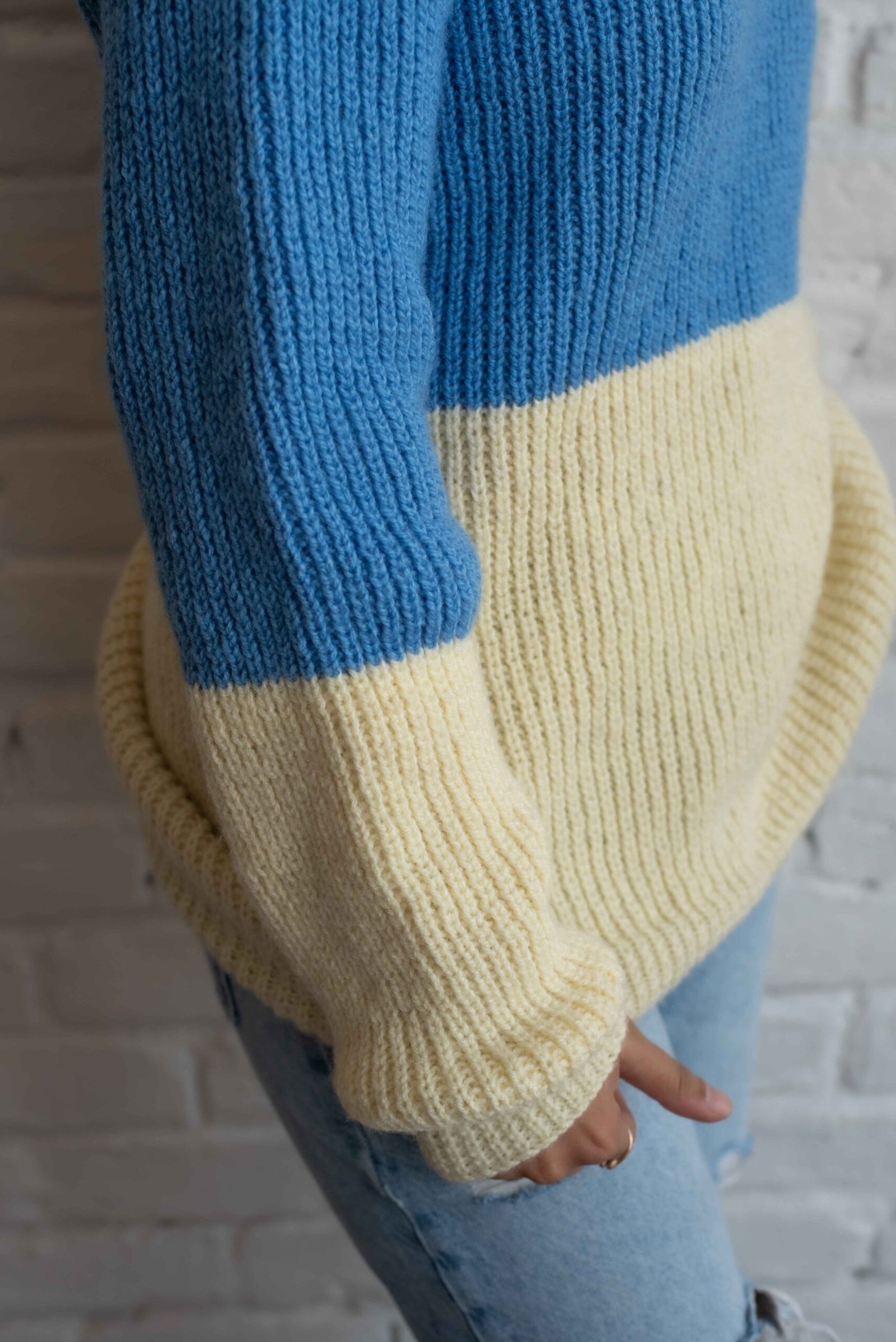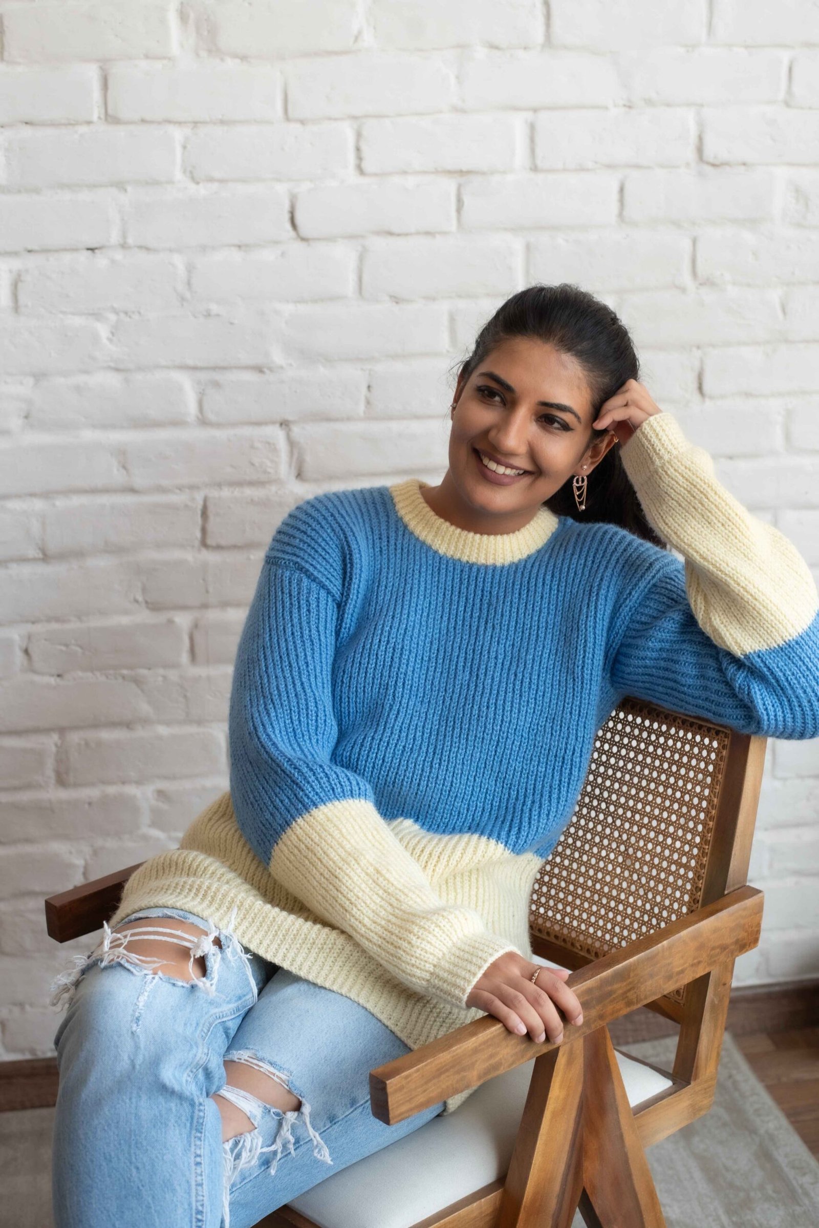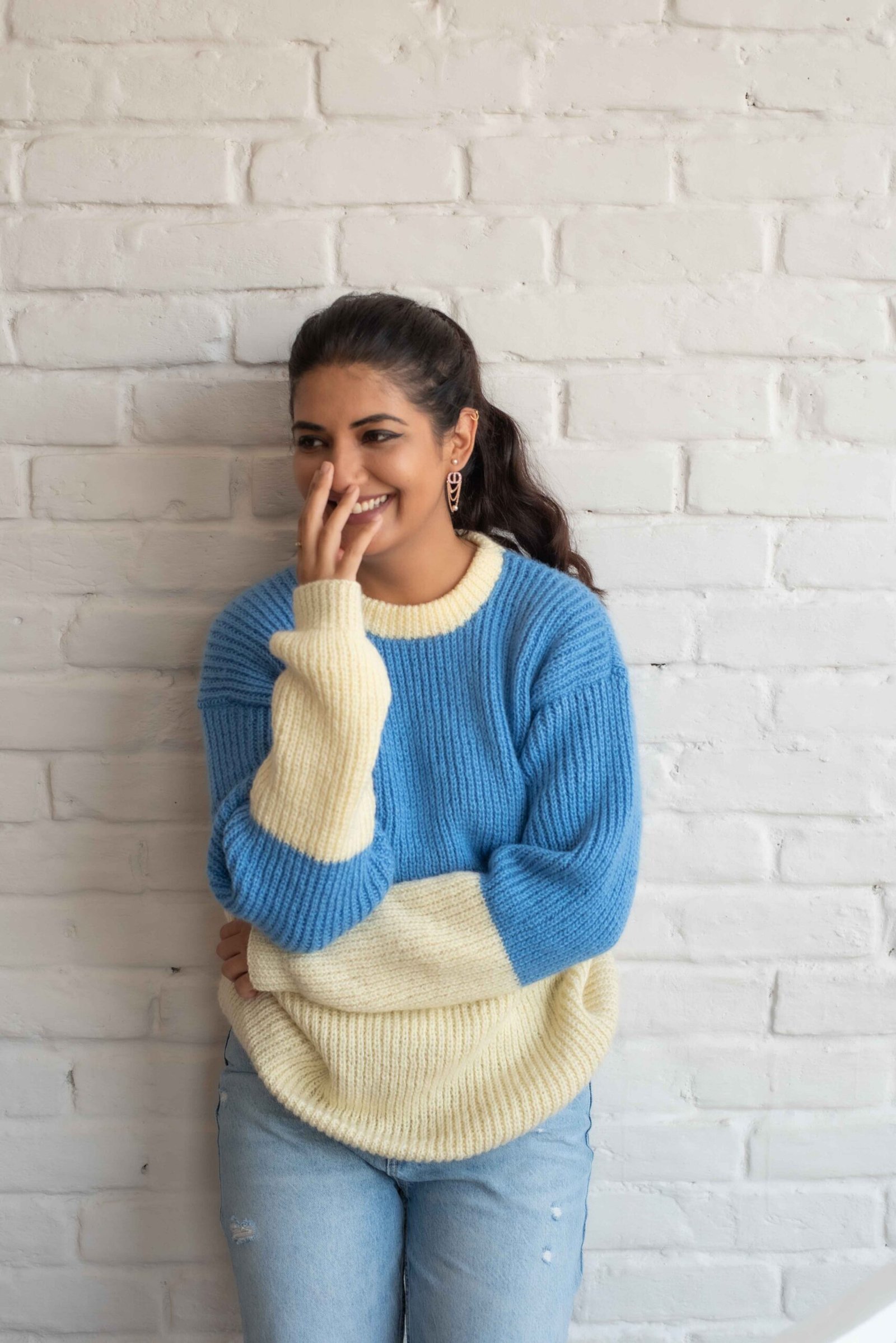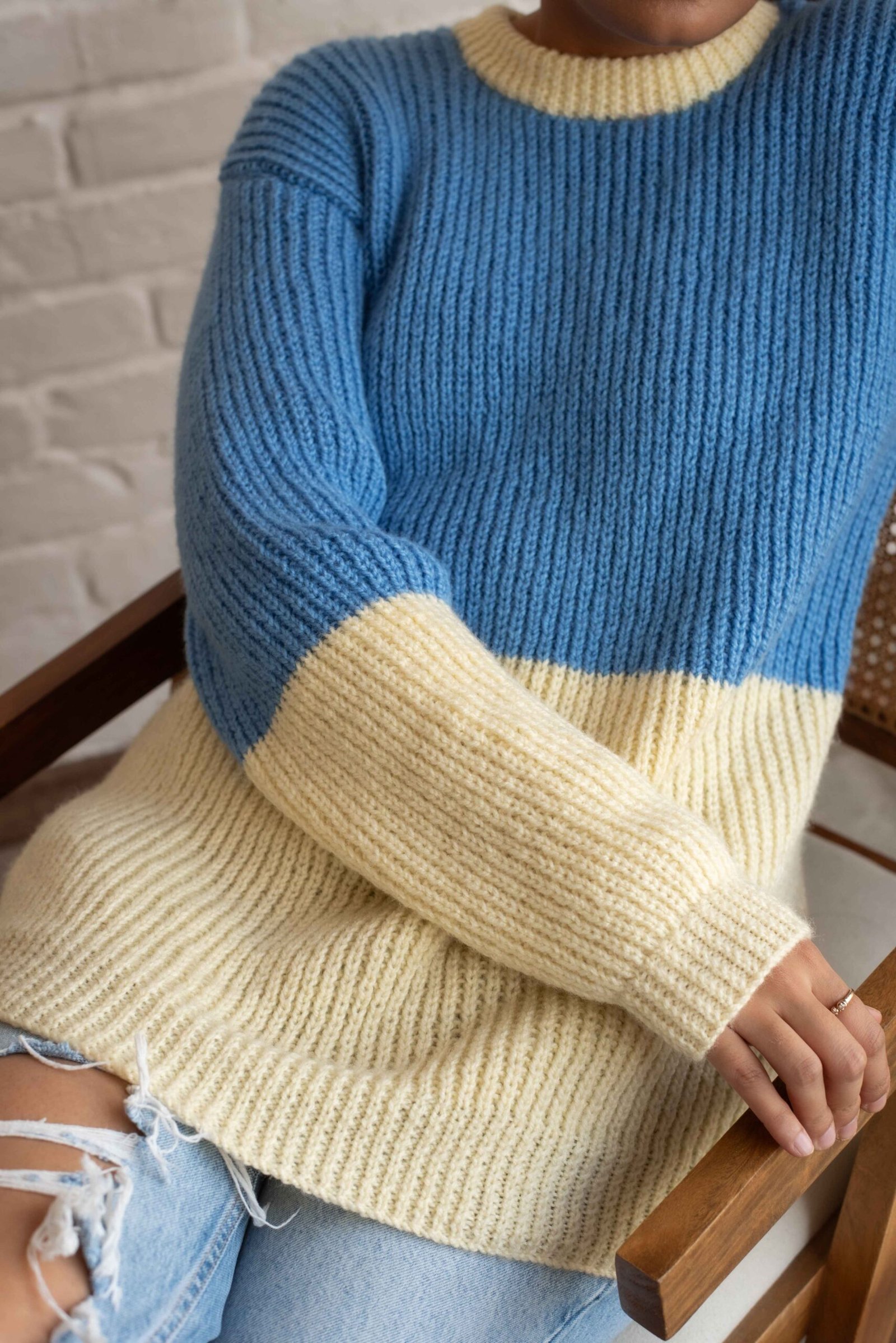 This playful color-block sweater, made from a cozy blend of acrylic and nylon, offers a soft and comfortable feel perfect for everyday wear. Featuring contrasting shades of sky blue and cream, it brings a fresh, cheerful vibe to any outfit. The oversized fit and ribbed texture add to its laid-back appeal, while the long sleeves and relaxed neckline make it a great choice for layering.