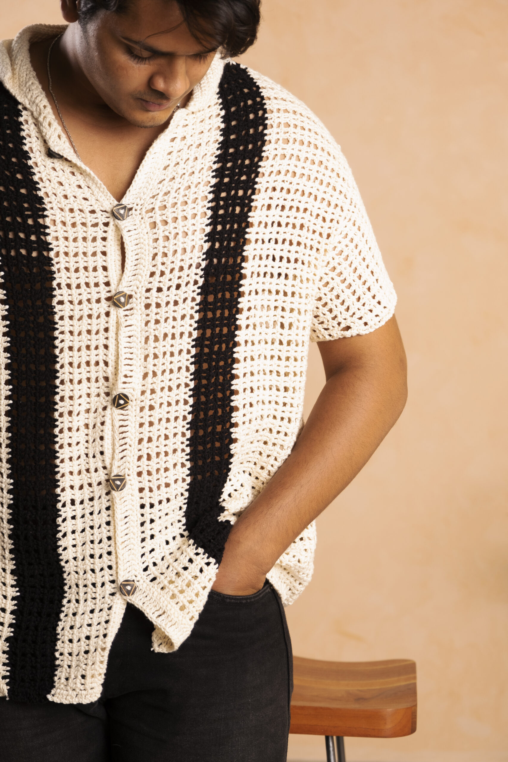 Crafted with breathable openwork crochet, this shirt redefines casual menswear with a handcrafted touch. The striking black vertical stripes contrast beautifully with the ivory body, making it a versatile layering piece or standalone statement.