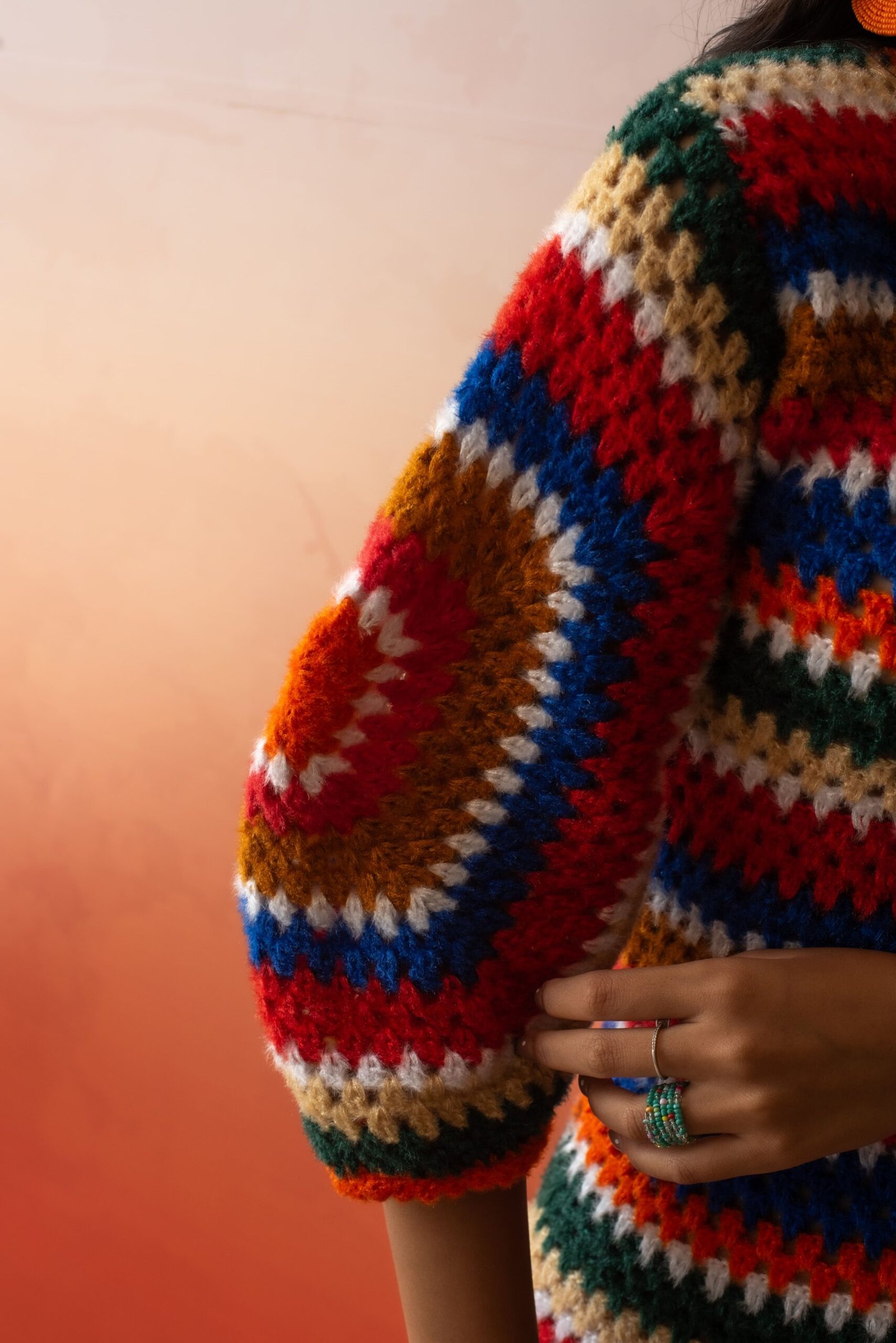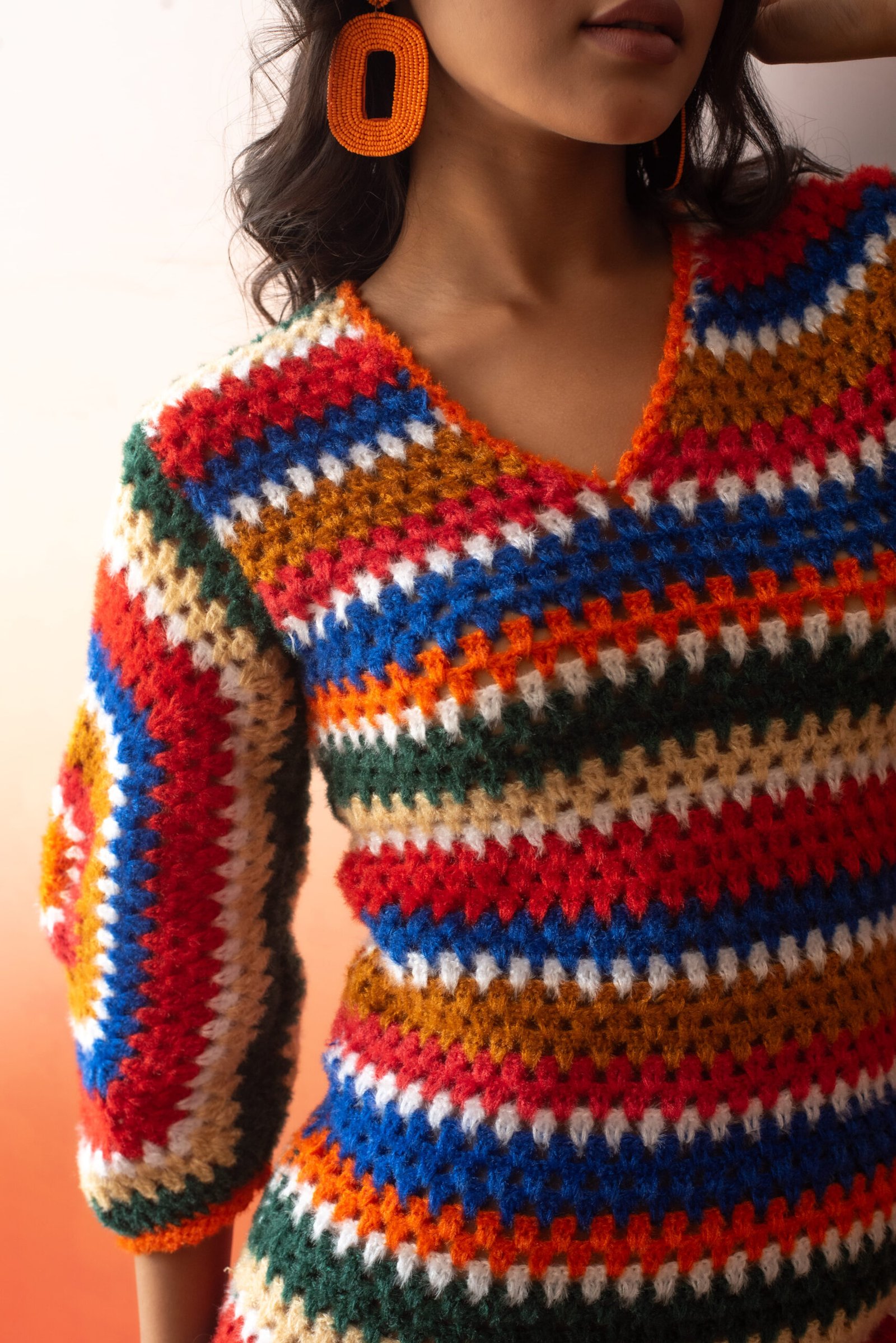 This is a colorful crochet mini-dress featuring a vibrant striped pattern with shades of red, blue, green, orange, and beige. The dress has a V-neckline and long sleeves, offering a cozy yet fashionable look. The textured design adds a boho-chic vibe, perfect for casual outings or laid-back summer days. Paired with statement earrings, a woven clutch, and slip-on sandals, this outfit blends comfort and style effortlessly. The dress is perfect for those who love to stand out with a bold and playful aesthetic.